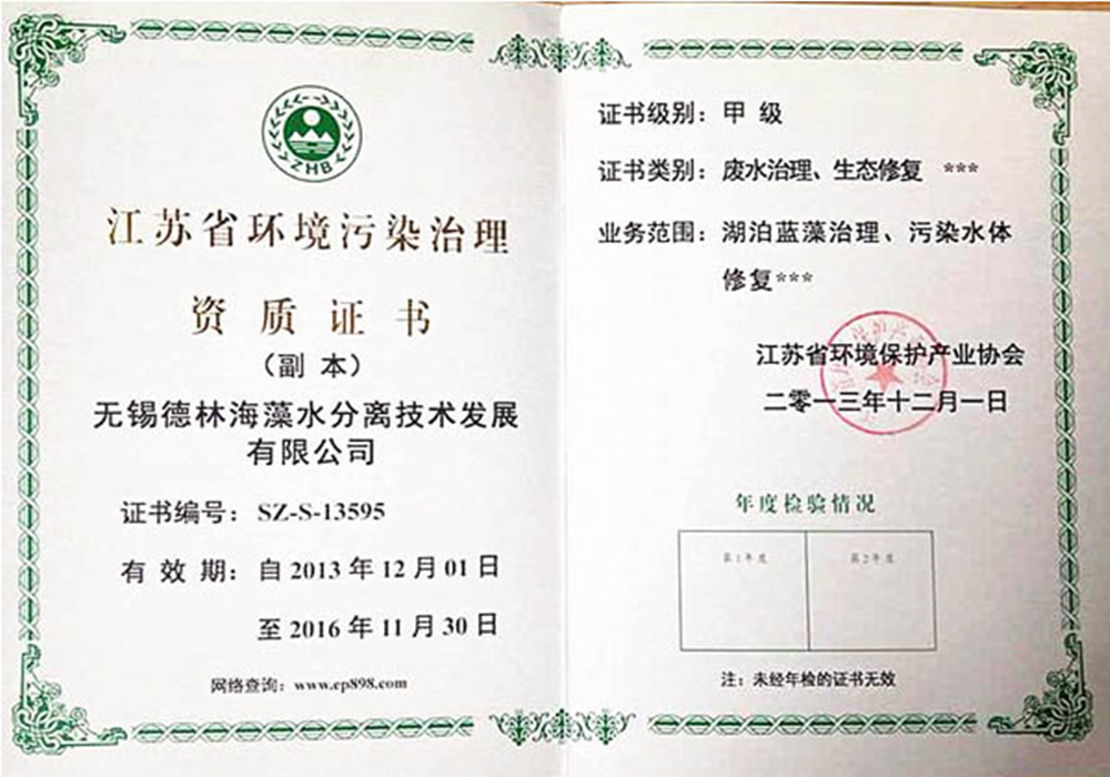 無錫德林海藻水分離技術(shù)發(fā)展有限公司于2013年12月1日榮獲環(huán)境污染治理甲級資質(zhì)證書,業(yè)務(wù)范圍是湖泊藍(lán)藻治理、污染水體修復(fù)。此證書是本行業(yè)全國范圍內(nèi)藍(lán)藻治理、污染水體修復(fù)的甲級資質(zhì)證書。