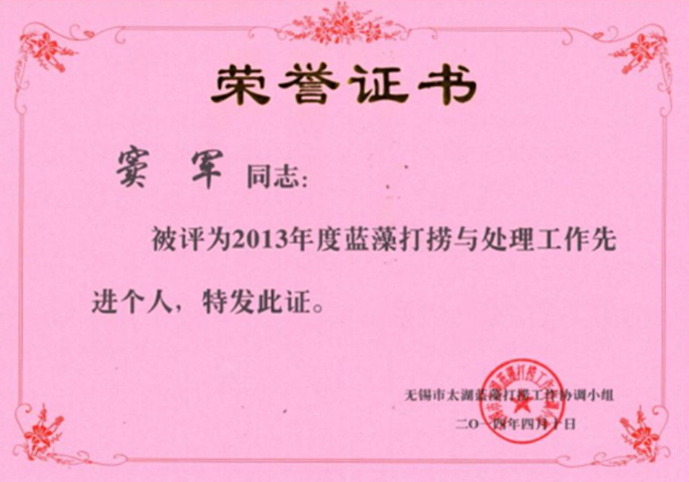 2015年4月21日上午,無錫市太湖藍(lán)藻打撈工作協(xié)調(diào)小組舉行頒獎(jiǎng)儀式,表彰在2013年在太湖藍(lán)藻打撈、處理工作中的先進(jìn)集體與個(gè)人。我公司員工竇軍榮獲“2013年度藍(lán)藻打撈與處理工作先進(jìn)個(gè)人”稱號(hào)。