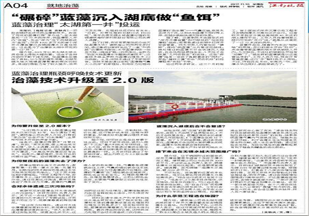 我司用兩年多時間,通過集成創新研發出了一套“升級版”治藻技術路線:水華藍藻渦吸→加壓滅除→推流擴散→自然凈化,全稱為“加壓滅除藍藻水華整裝成套技術”。這套技術被業界稱為藍藻治理技術2.0升級版。上月,該技術通過了專家組評審。該技術是在通過發現“藍藻靠氣囊大小沉浮”的原理后,利用壓力處理將藍藻的“救生圈”——氣囊壓扁,致其失去浮力下沉,從而達到藍藻不用打撈上岸、在湖中就能快速滅除的效果。