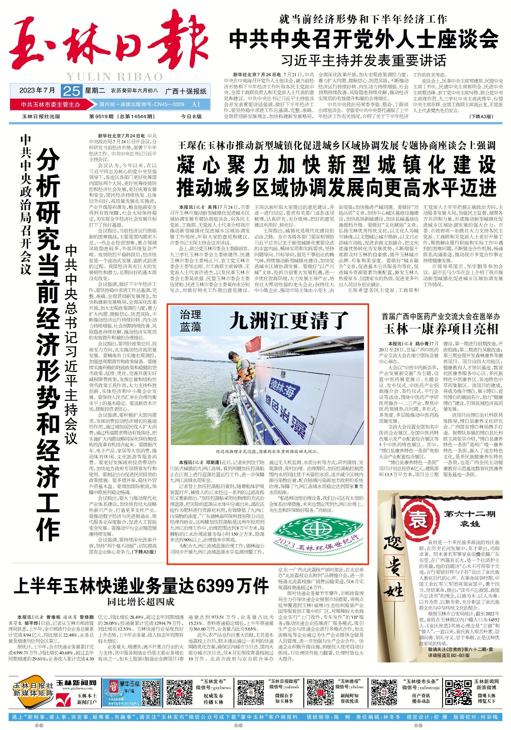 《玉林日報》頭版報道《治理藍(lán)藻——九洲江更清了》