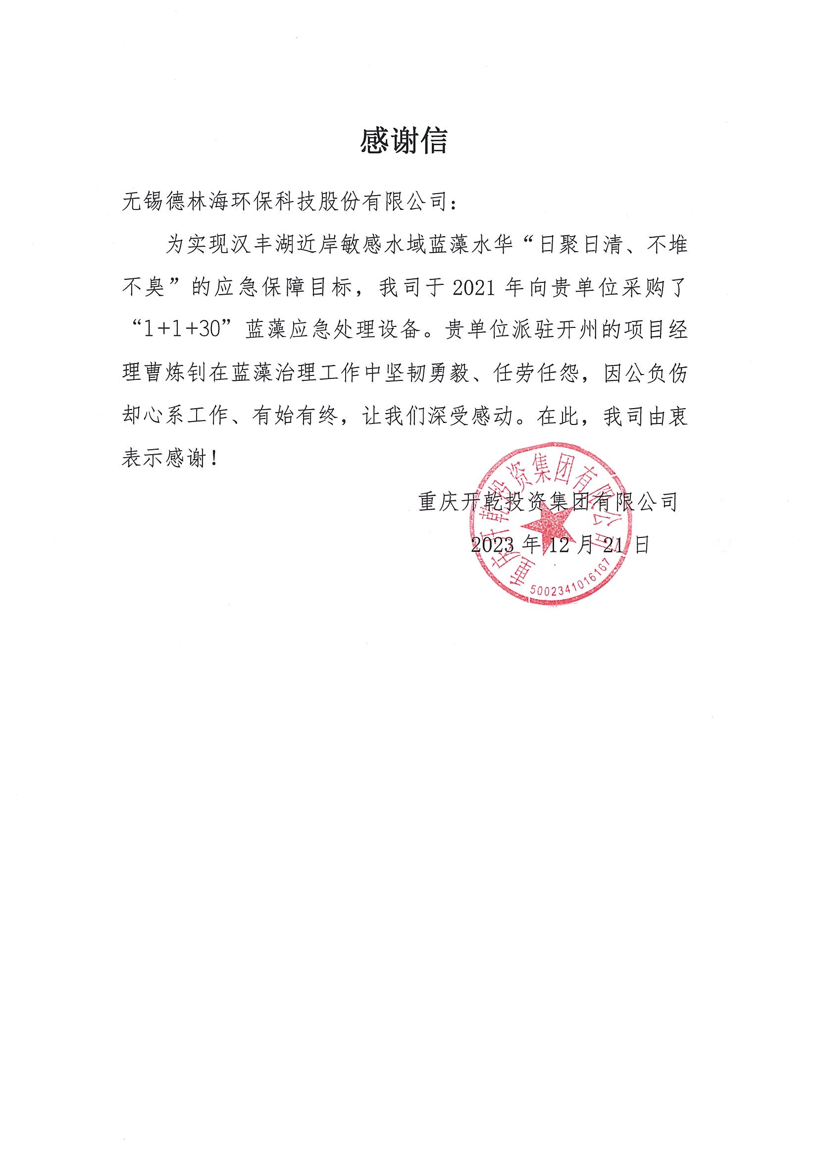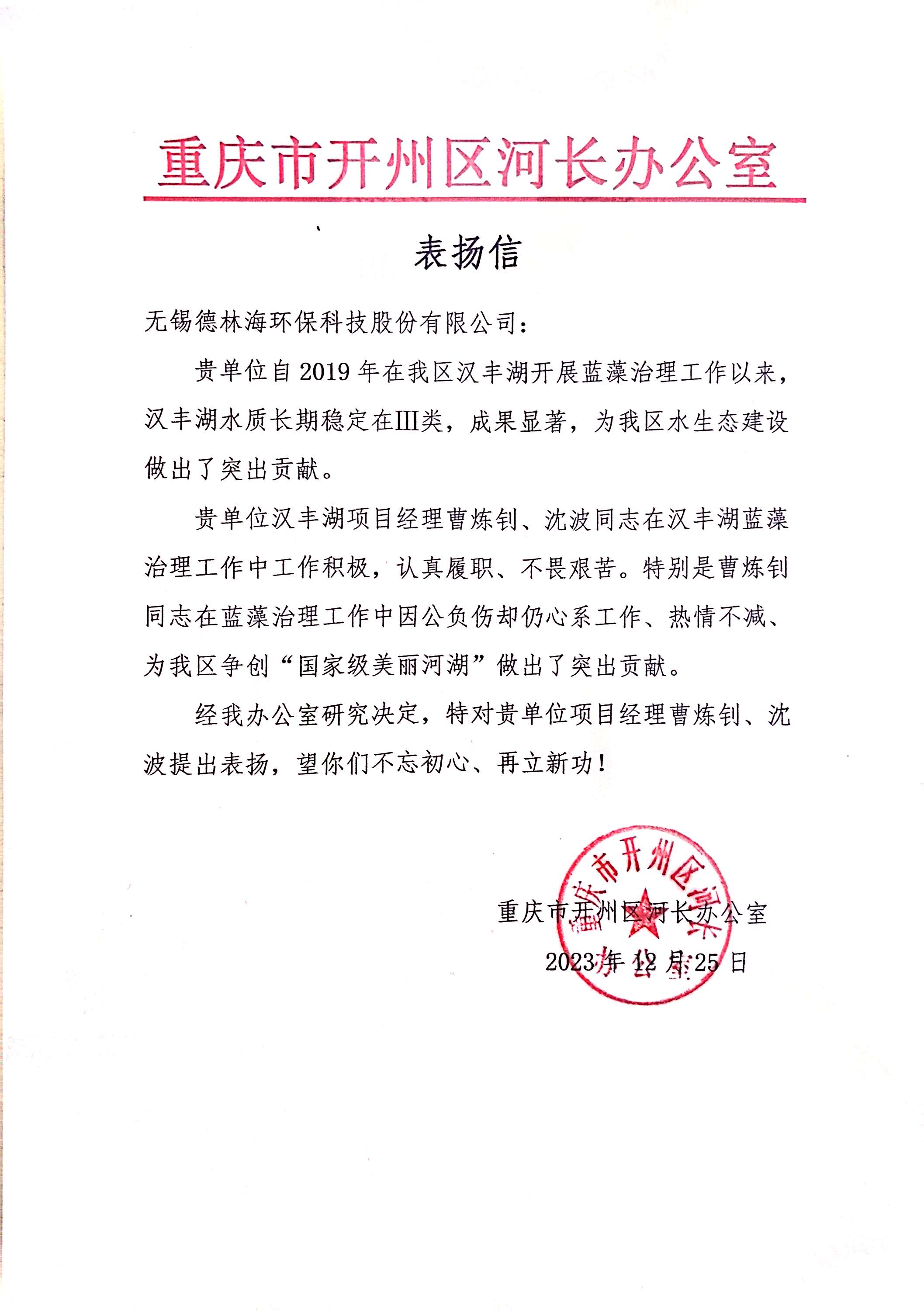 近日,德林海接連收獲喜訊,重慶市開州區河長辦公室、重慶開乾投資集團有限公司分別向我司發來表揚信與感謝信,以表彰德林海在漢豐湖藍藻治理工作及當地水生態建設工作中的突出貢獻。文中還特別對我司員工曹煉釗和沈波在工作中表現出的堅韌勇毅、不畏艱苦等優秀品質予以高度肯定。